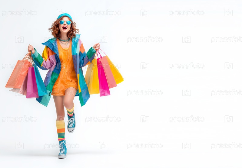 Веселая девушка с цветными сумками после покупок на белом фоне