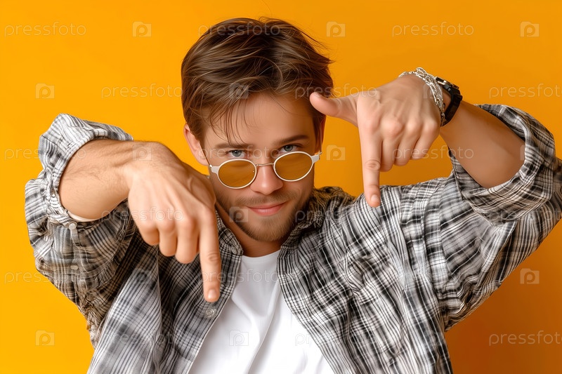 Молодой человек в очках и квадратной рубашке указывает пальцами вниз