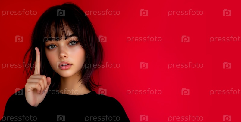 Брюнетка с короткими волосами в черной одежде указывает на красный фон