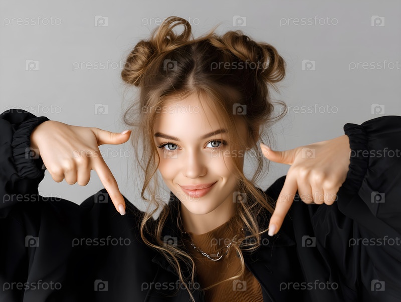 Молодая девушка указывает пальцами вниз на светлый фон