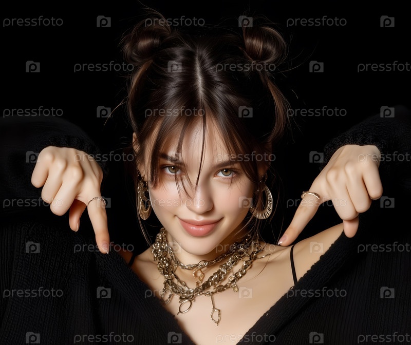 Улыбающаяся девушка в черной одежде с ювелирными украшениями на чёрном фоне