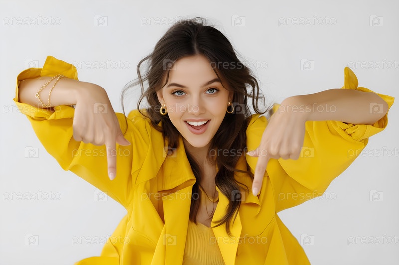 Улыбающаяся девушка в желтой одежде указывает вниз, на белом фоне