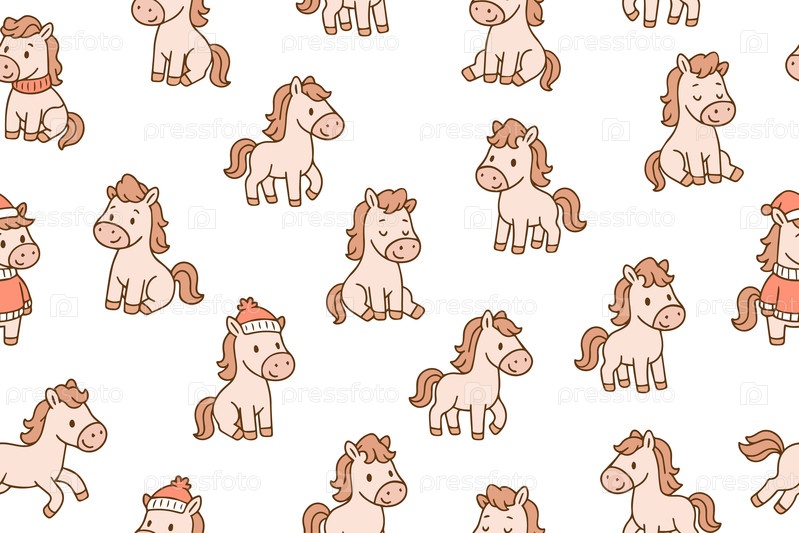 Бесшовный рисунок милых лошадей на китайский Новый год 2026, плоская векторная иллюстрация. Знак зодиака, характер животного кавайи. Традиционные элементы праздничного дизайна. вектор