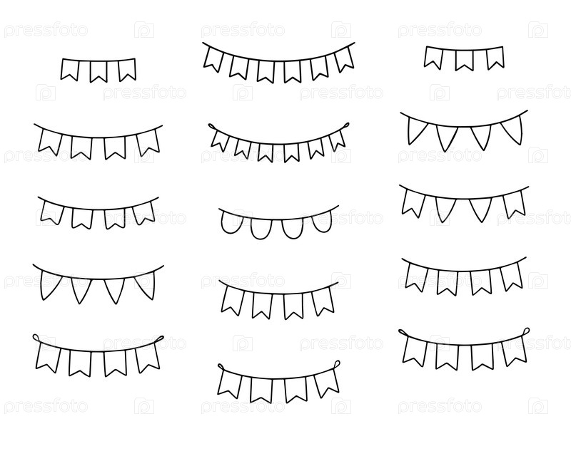 Руки растягивали праздничные гирлянды флагов, гирлянды флагов разных форм для украшения дня рождения, карнавала, цирка и праздников. вектор