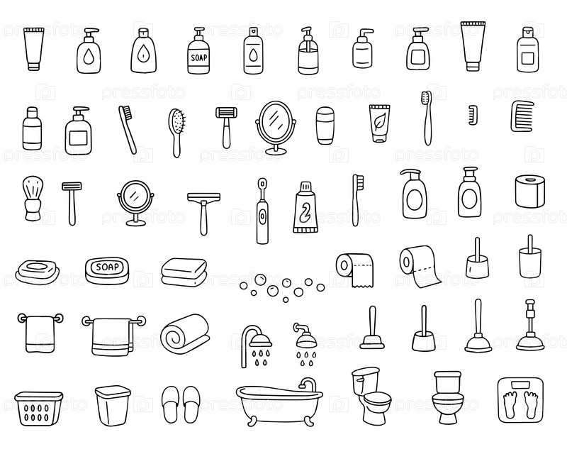 Векторные иконы ванной комнаты и туалетных комнат в стиле рисунка. Душ, баня, унитаз, бидет. Косметика, шампунь, гребень, крем. Туалетная бумага, салфетки. Иллюстрация вектора
