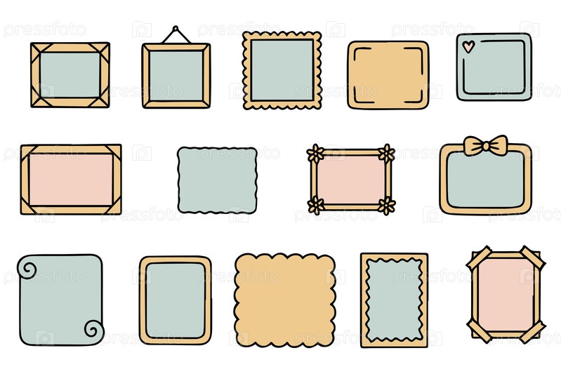 Набор винтажных рамок. Коллекция древних декоративных рам с рисунками на белом фоне. Ручно нарисованная векторная иллюстрация