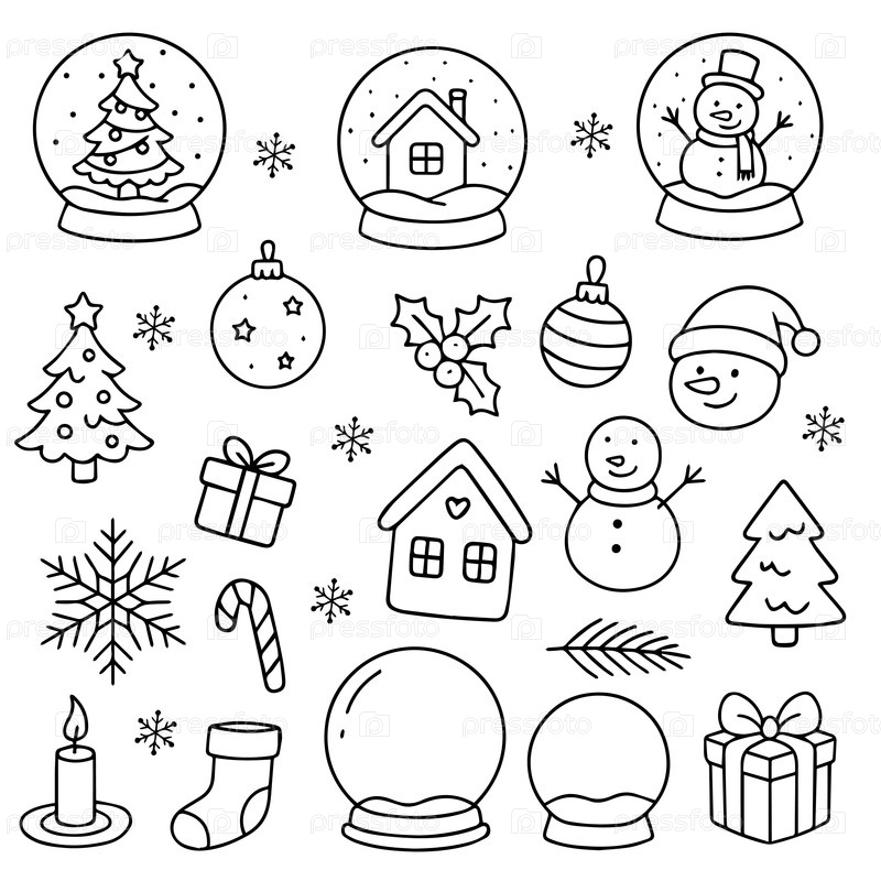 рождественские снежные шары и другие элементы. зимний сувенирный шар со снегом на стенде. красивый дом под снегом. векторная иллюстрация, рисунок. иллюстрация вектора