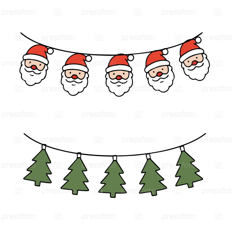 Коллекция новогодних и рождественских векторов. гирлянды с Санта-Клаусом и елки в стиле Doodle