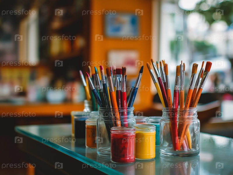 Витрина магазина с банками кистей и красок.Мастерская искусства
