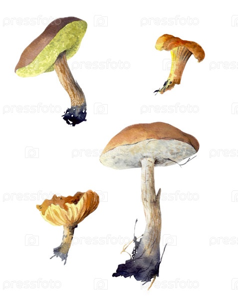 Набор акварельных грибов на белом фоне. Ручные акварели. Для ткани, обоев, упаковочной бумаги, поздравительных открыток, дизайна, декора и иллюстрации