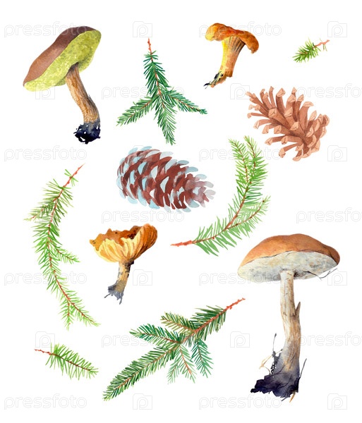 Набор акварельных рождественских ветвей, грибов и конусов на белом фоне. Ручные акварели. Для ткани, обоев, упаковочной бумаги, поздравительных открыток, дизайна, декора и иллюстрации