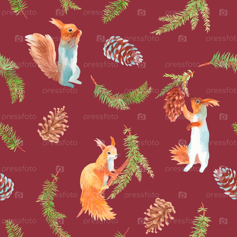 Бесшовный рисунок белки, ветвей и конусов пихты. Ручной акварель. Для ткани, обоев, упаковочной бумаги, поздравительных открыток, дизайна, декора и иллюстрации