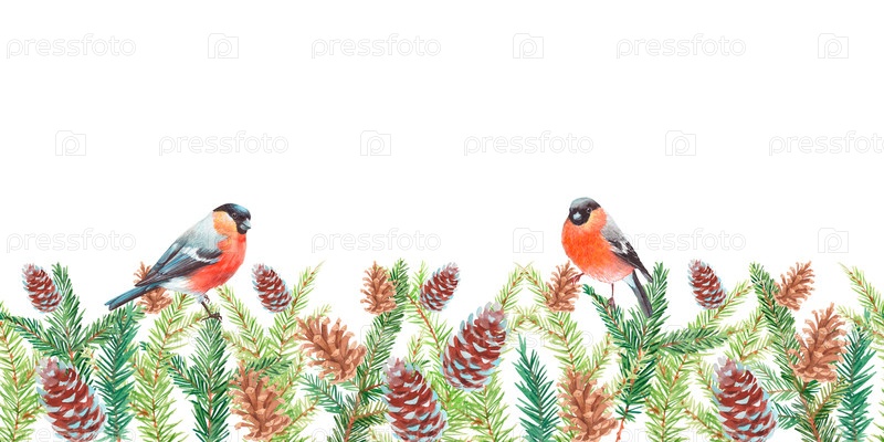 Бесшовная граница акварели Рождественские ветви, веники и шишки на белом фоне. Ручные акварели. Для ткани, обоев, упаковочной бумаги, поздравительных открыток, дизайна, декора и иллюстрации