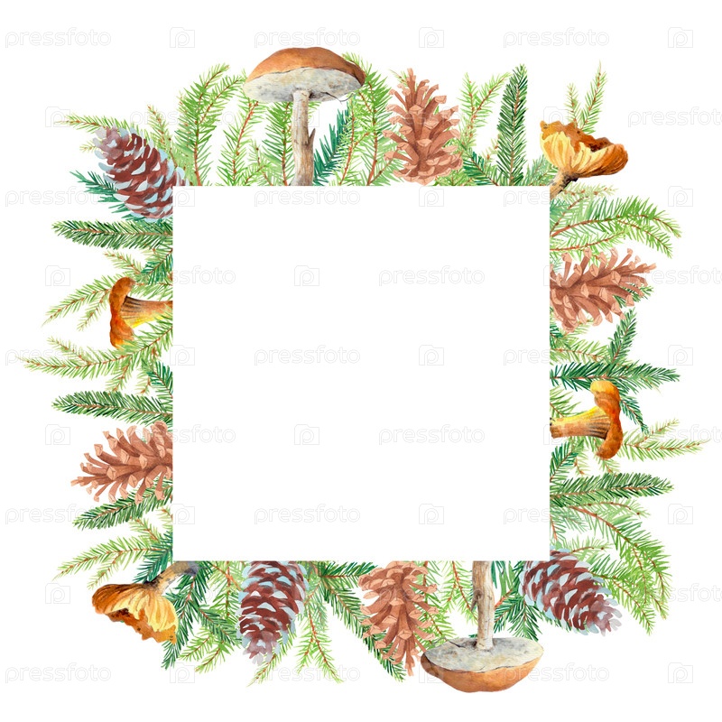 Прямоугольная рама акварели Рождественские ветви, конусы и грибы на белом фоне. Ручные акварели. Для ткани, обоев, упаковочной бумаги, поздравительных открыток, дизайна, декора и иллюстрации