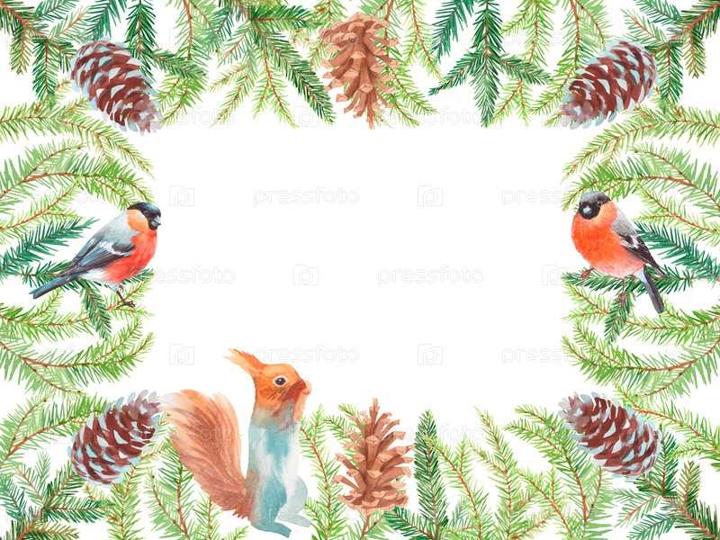 Прямоугольная рама акварели Рождественские ветви, белки, шишки и щупальца на белом фоне. Ручные акварели. Для ткани, обоев, упаковочной бумаги, поздравительных открыток, дизайна, декора и иллюстрации