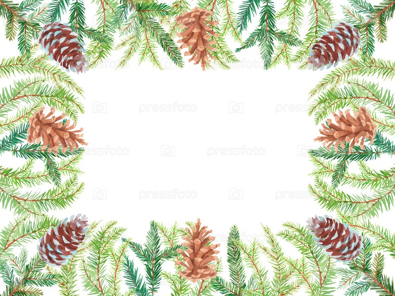 Прямоугольная рама акварельной краски Рождественские ветви и конусы на белом фоне. Ручные акварели. Для ткани, обоев, упаковочной бумаги, поздравительных открыток, дизайна, декора и иллюстрации