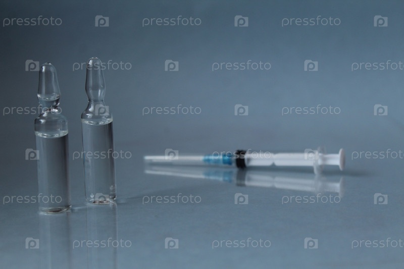 Вакцина в бутылке со шприцем лекарство на синем фоне
