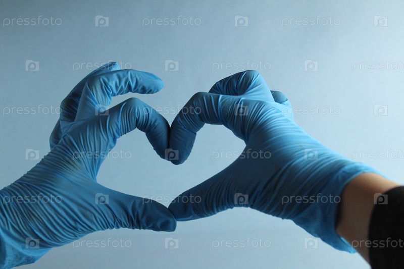 Руки врача или медсестры в синих медицинских перчатках показывают любовь сердца на светло-синем фоне с местом для отправки текстовых сообщений