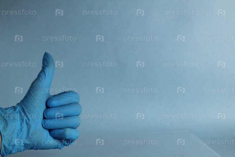 Рука женщины в силиконовой медицинской перчатке с поднятым большим пальцем. фигура пальца, обозначающая белый изолированный фон. тенденция защиты от коронавируса - COVID-19