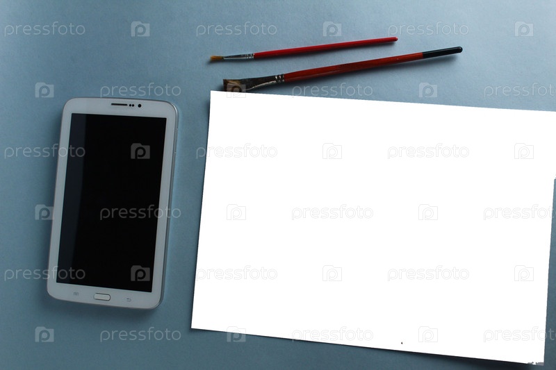 Онлайн-тренировка по рисованию планшета и листа белой бумаги с узором на светло-синем фоне с макетом и местом для текста