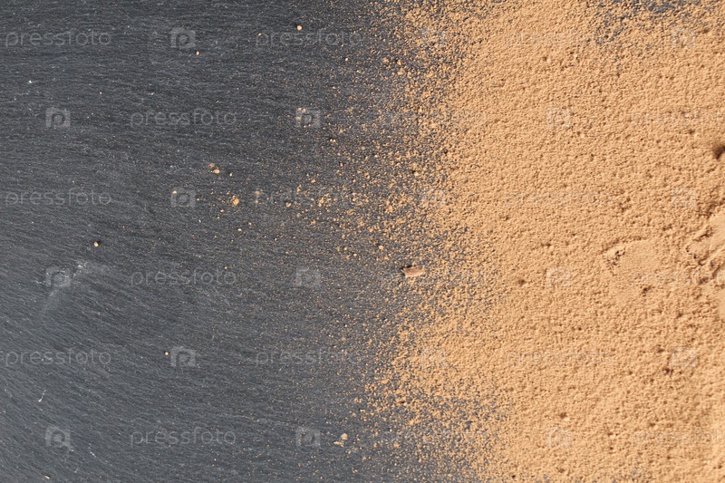 Фон на черно-сером камне рассыпанный какао-порошок справа в углу