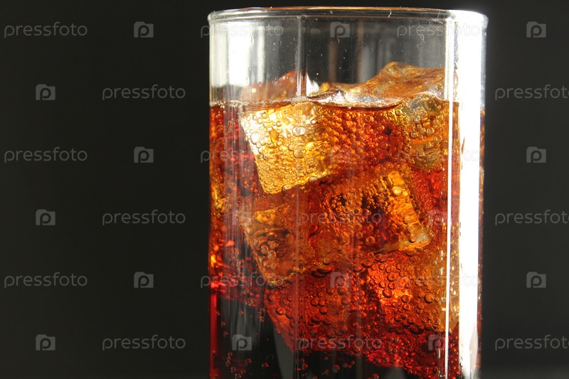 Макро напиток kvas Cola с ближайшими пузырями льда в питьевой соде на тёмно-черном фоне