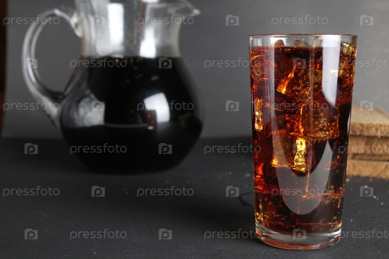 Темный квас-хлеб заливается в стакан сварки и стоит в кружке на сером черном фоне с пространством для текста и копирования