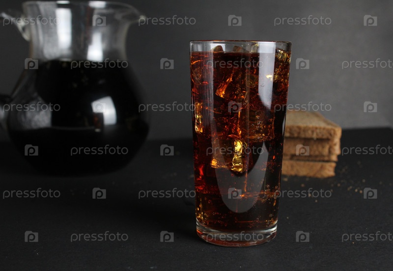 Темный квас-хлеб заливается в стакан сварки и стоит в кружке на сером черном фоне с пространством для текста и копирования