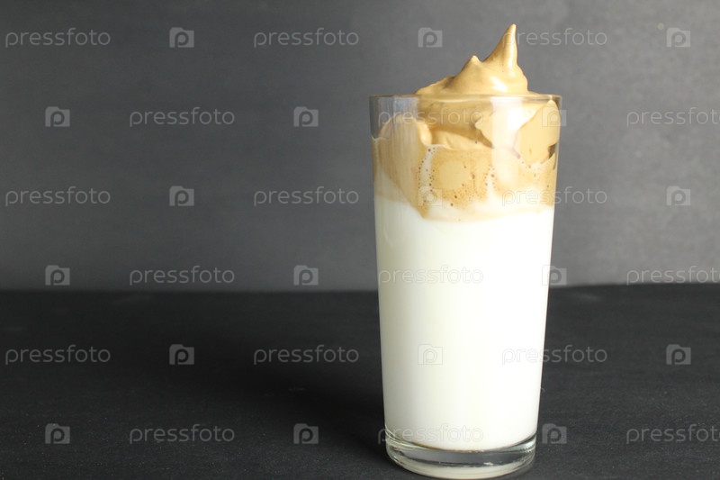 Кофе Dalgon с молоком и кофейной пеной в стакане на черном фоне с пространством для копирования текста