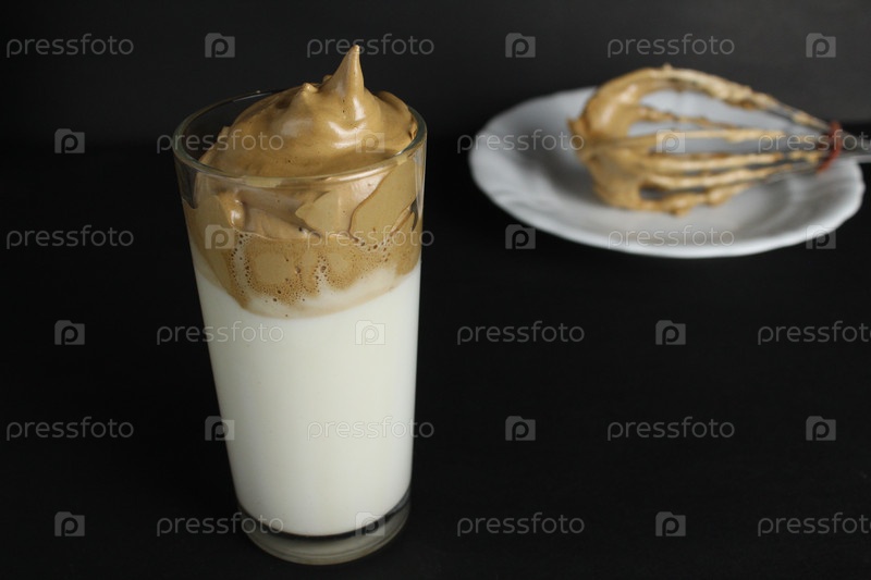 Кофейное молоко Dalgon с пенным кофе и льдом в стакане на чёрном темном фоне с местом для написания модного напитка