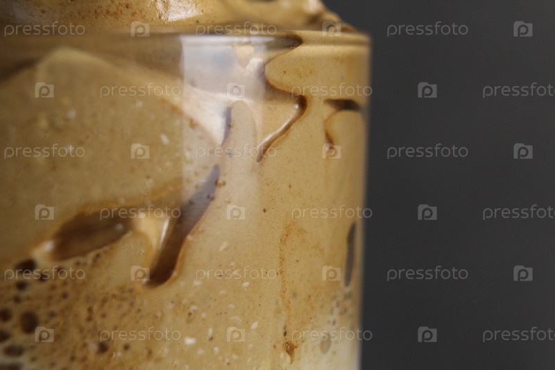 Пена из кофейного молока на ближайшем стеклянном фоне пищи
