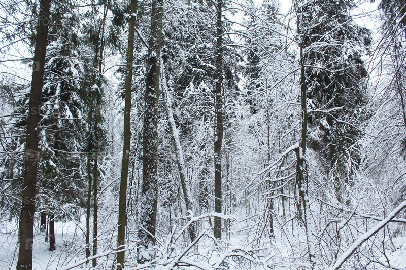 Покрытые снегом стволы деревьев и съеденные вблизи