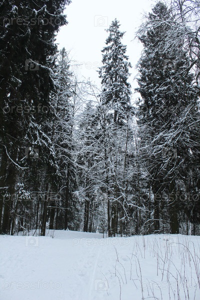 Высокие ель, сосны в снежную зиму в лесу.Готовимся к Рождеству