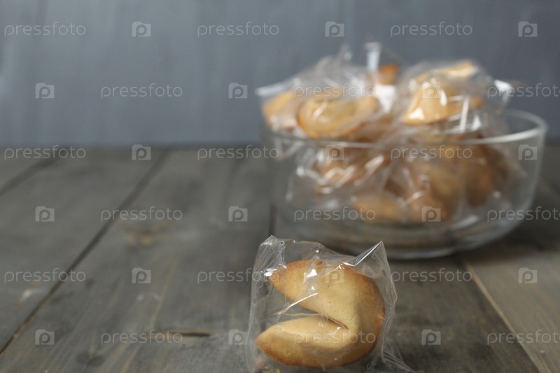 Традиционное предсказание Нового года с печеньем на сером фоне с текстовым пробелом