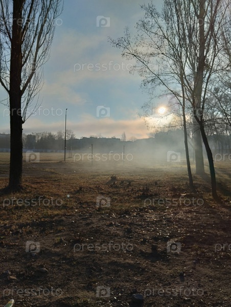 Туман или дым распространяется по всей земле. восход солнца в природе. утренний пейзаж