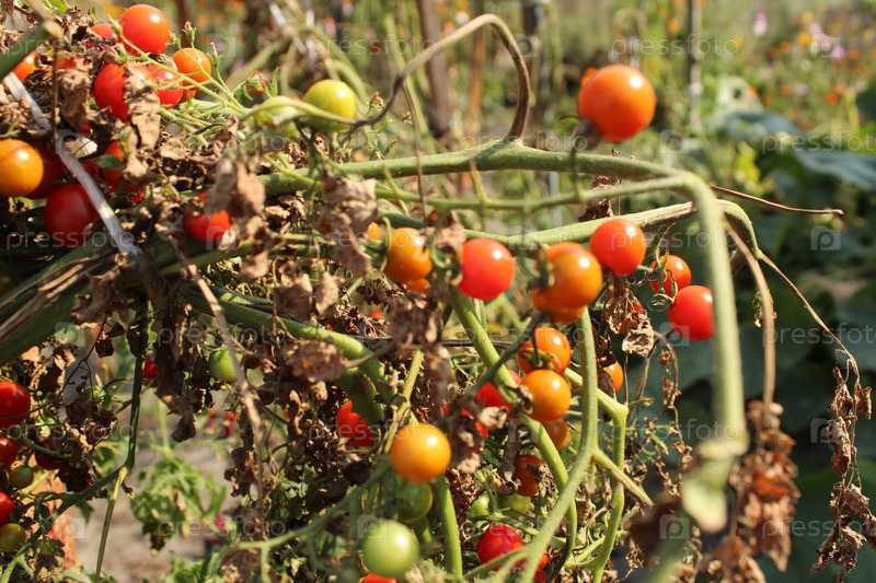 Маленькие вишневые помидоры на кусте, последний урожай томатов