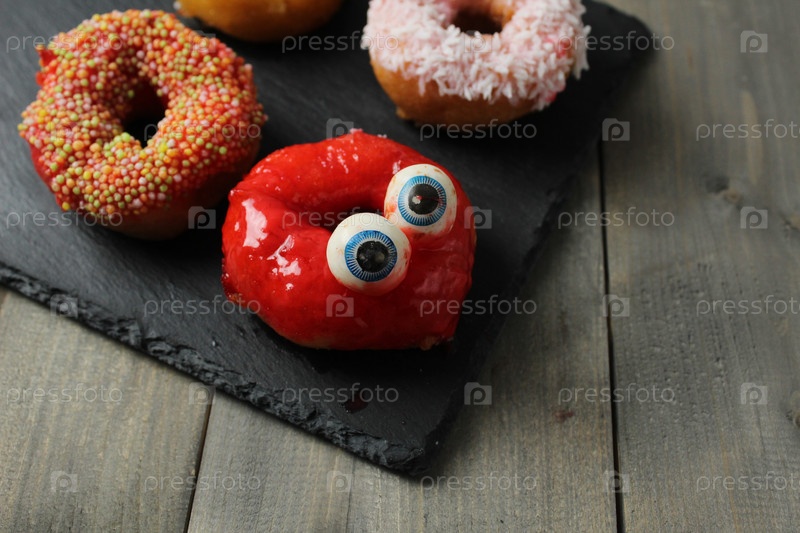 Хэллоуинский торт с голубыми глазами на сером треке с текстовым пробелом