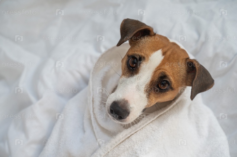 Джек Рассел Терьер лежит на спине, завернутый в белое полотенце
