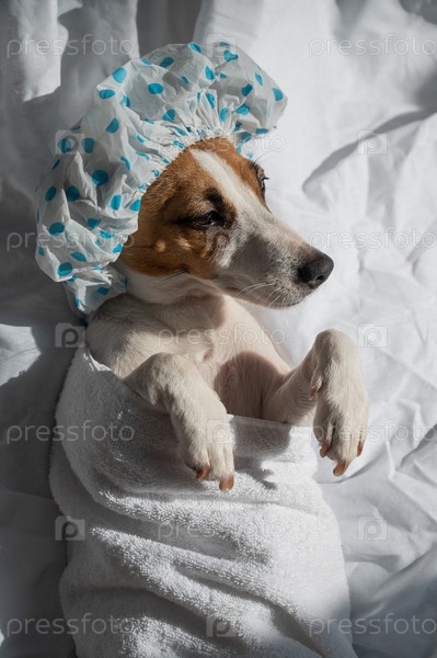 Джек Рассел Терьер в душевой шляпе и полотенце