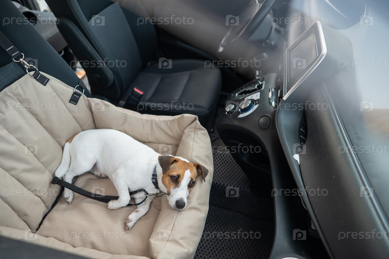 Собака-терьер Джек Расселл в специальном автокресле