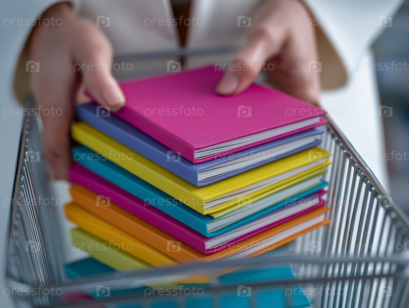 Женщина кладет кучу красочных тетрадей в корзину на розовом фоне