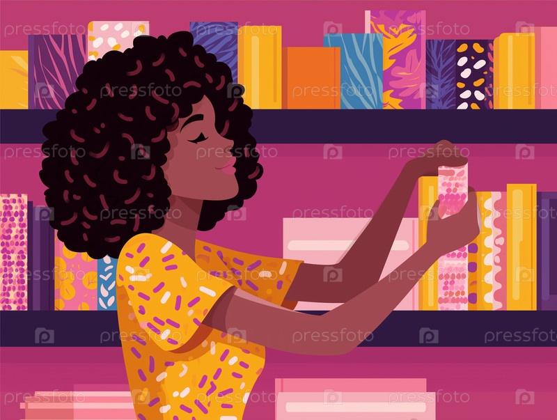 Женщина с локонами выбирает ткань или упаковку в магазине, иллюстрация