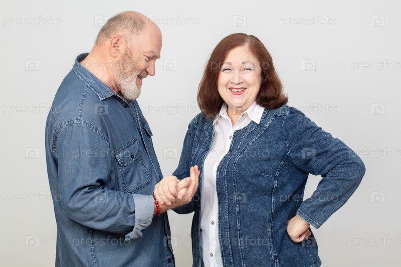 Портрет пожилой пары в джинсах.Взрослый муж общается со смешной старой женой