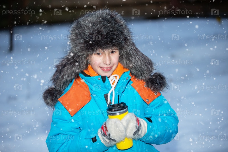 Портрет маленького мальчика в пушистой зимней шляпе с термосом в руках