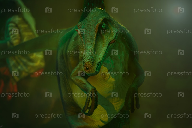 Зеленый доисторический манекен динозавра в мистическом свете