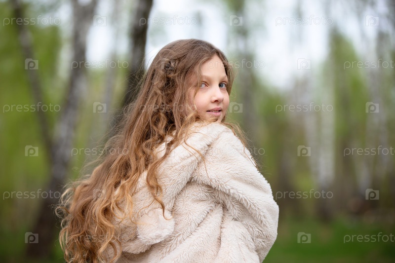 Красивая голубоглазая девушка с длинными волосами в меховом пальто позирует на фоне природы