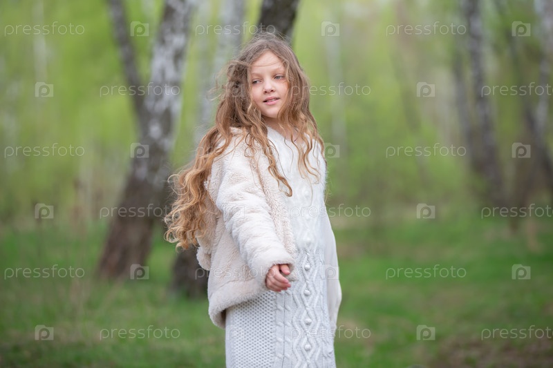Красивая девушка с длинными волосами в меховом пальто позирует на фоне березовой рощи