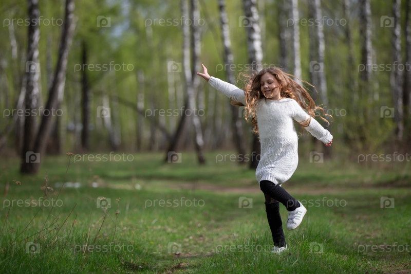 Маленькая девочка бегает по весеннему лесу, ребенок гуляет в парке