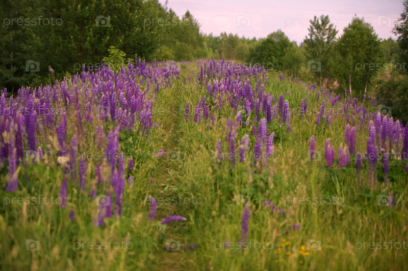 Красивый природный фон луга, покрытого фиолетовыми цветами люпина