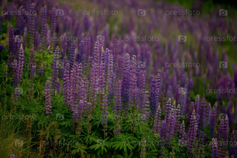 Красивый природный фон луга, покрытого фиолетовыми цветами люпина